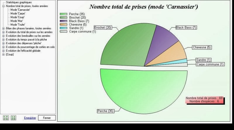 -Son système de statistiques annuelles ventilées par mode pêche permet d’évaluer finement ses résultats. Le nouveau système de statistiques années après années permet même d’évaluer la progression de certains paramètres, comme le nombre de prises par mode, le temps passé au bord de l’eau, l’évolution du budget pêche, la lune…